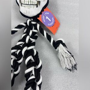 Fun skeleton rope dog toy with orange accent. Perfect for playful pets.