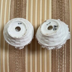 Enhance your dressing table with these elegant, ceramic white floral perfume bottles. Tops lift up to reveal small wells to hold your favorite perfume.