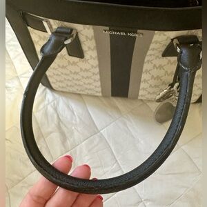 Stylish Michael Kors satchel with black and white design. Features signature MK pattern and silver accents. Perfect for versatile use.