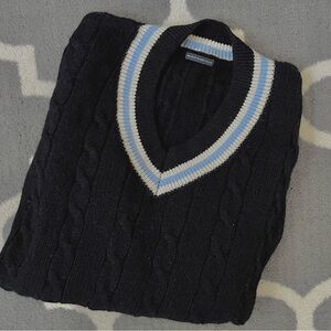Elegant navy 90% wool sweater with stylish blue and white trim. Classic cable knit style. Perfect for versatile wear.great for cold weather. So cozy and keeps you warm .