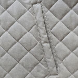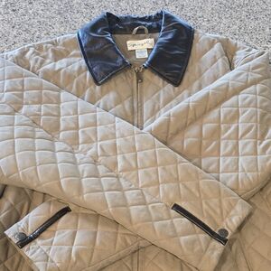 Stylish, quilted beige jacket, Men's L, featuring dark faux leather trim. Perfect for a chic sporty look. Cuffs snap and two snapping vents in the rear.