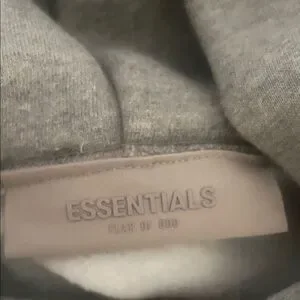 Cozy light gray hoodie with Essentials logo on chest. Features a front pocket and hood.