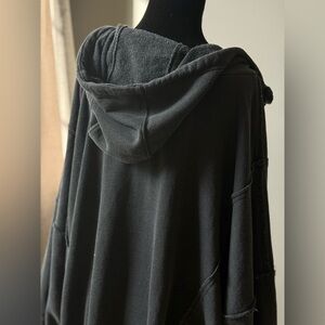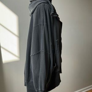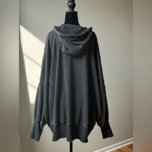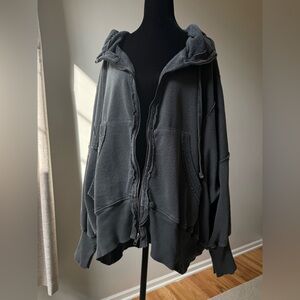 Cozy oversized hoodie. Features front pockets and zip closure. Perfect for layering.