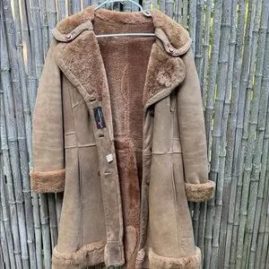 70s vintage penny lane style coat made in Madrid, Spain. Stay warm and stylish with this elegant tan shearling with teddy bear lining. In good condition. See photo of one underarm seam that needs to be sewn.
