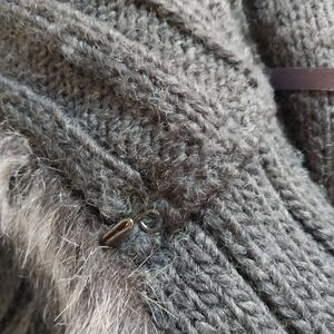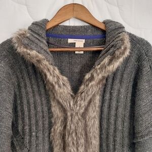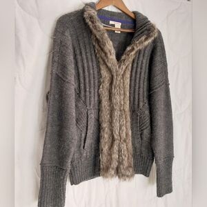 Vtg DKNY Women's Medium Wool Blend Knit Cardigan Faux Fur Trim Y2K Grey Sweater