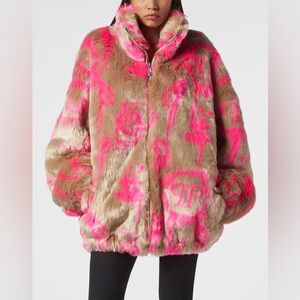 Philipp Plein Multicolor Heart-Print Faux-Fur High-Neck Coat