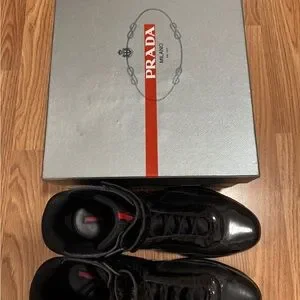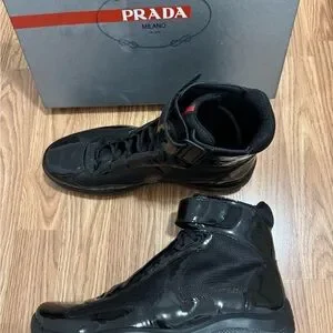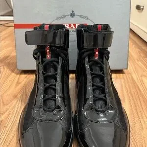Sleek black high-tops with a striking red accent. Modern design for everyday wear. Comfortable and stylish.