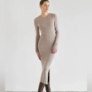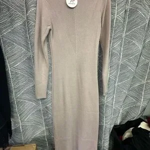 This elegant taupe knit maxi dress offers a sophisticated look for any occasion. The soft fabric and sleek design ensure comfort and style. Perfect for both casual and formal settings.