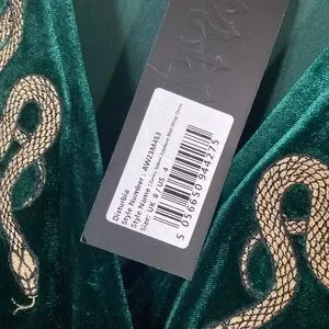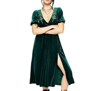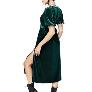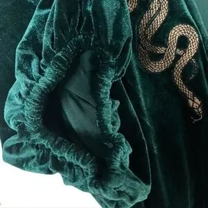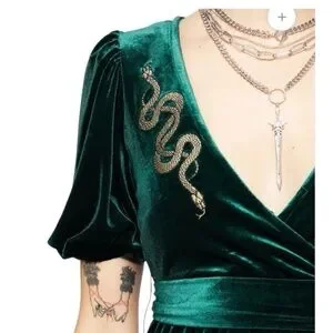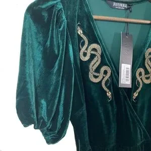 New with Tags Emerald jewel-tone green witchy goth velvet velour Midi dress. Side seam slit, removable matting belt. Deep v-neck wrap style bust with embroidered gold snake appliqué around neckline. Gathered, elastic puff princess sleeves. Fit and flare shape, elastic waist, pullover style. Item no. AW23M453 Disturbia