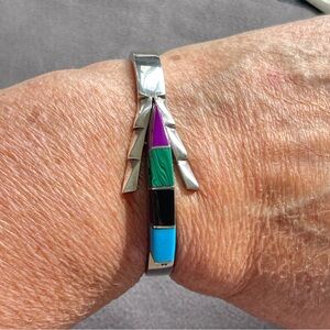This is a colorful and very solid vintage Taxco hinged cuff bracelet with multiple inlaid stones in blue, violet, green and black. Likely they are Turquoise, Sugilite, Onyx and Malachite. I’m unsure if these are genuine stones—They look too perfect lol.