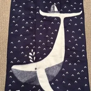 Cozy blanket featuring a playful whale design. Soft navy background with white accents. Perfect for a child's room.