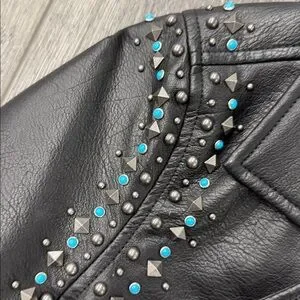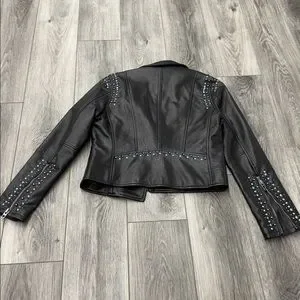 Sleek black vegan leather jacket with stylish studs. Perfect for a bold look. Worn once