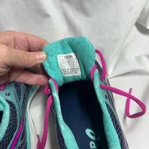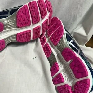 Elevate your workout with ASICS athletic shoes. Stylish navy and teal design with vibrant pink accents. Perfect for performance and comfort.