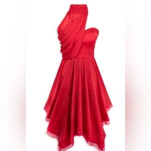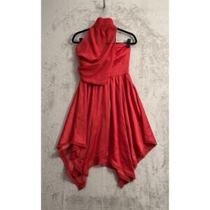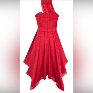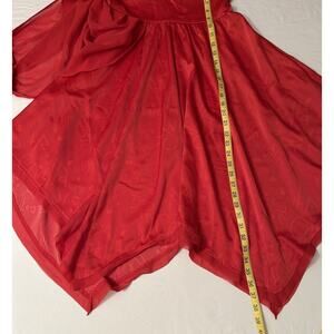 In preowned excellent condition Disney Parks Cruella De Vil Evening Dress Size Small. A strapless sweetheart neckline, off-the-shoulder evening dress that is inspired by the dress worn by Cruella in Disney's live-action (2021) movie, it features a "tattered" bias-cut hem and collar with a ruched attached panel that drapes across front of shoulder and around the neck with a ruched button-up collar. Dress has red on red graffiti print fabric, gathered skirt, tattered" bias-cut handkerchief styled hem, includes pockets, zip back with hook and eye closure.