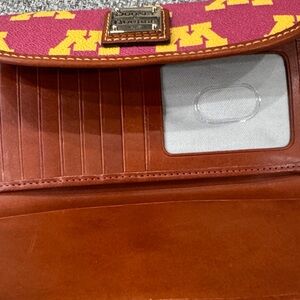 Chic Dooney & Bourke wallet with a bold burgundy and gold pattern. Ideal for daily essentials.
