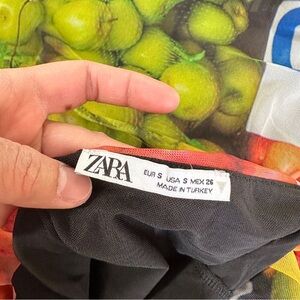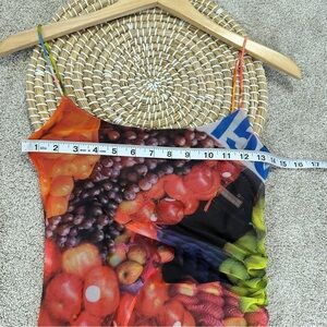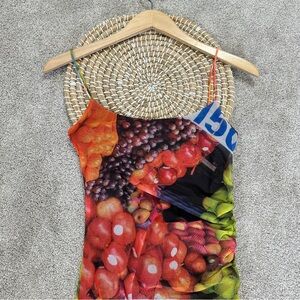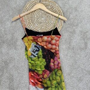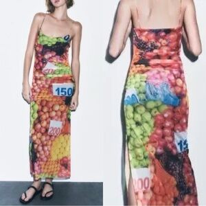 Zara Ruched Mesh Maxi Dress Strappy Sleeveless Fruit Stand Print Colorful Size S