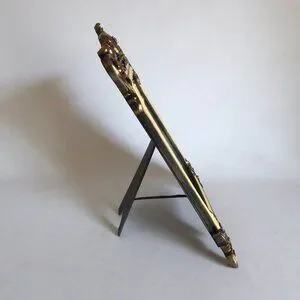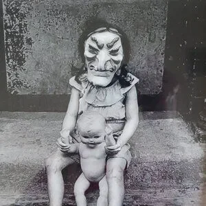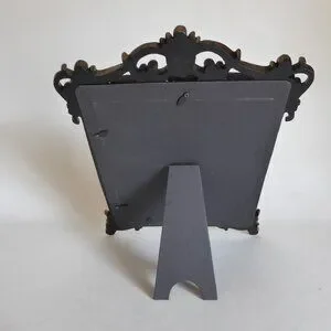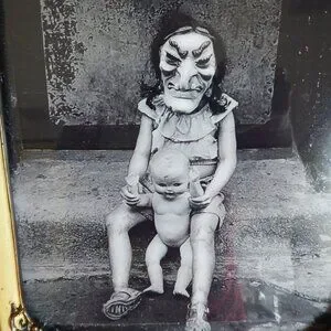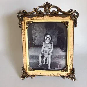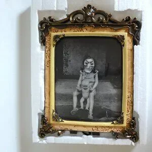 New in box, never displayed, easel backed, gothic frame, with an image of a creepy, girl in a Halloween witch mask, holding a doll. This was purchased at an oddities show to use in our annual Halloween decorations. Perfect for setting on a table. The frame appears to be made out of resin. (See photos for details) I am the original owner. It has been in climate controlled storage since purchased. Comes from a pet and some free home.