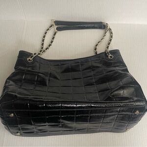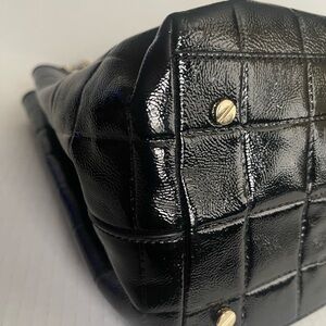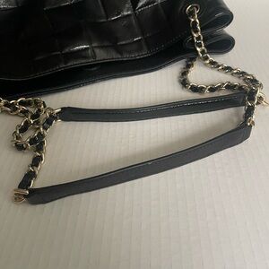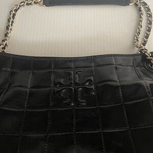 Tory Burch Elegant black quilted patent leather Marion tote bag with chain handles. Perfect for any occasion. Great condition. Small spot on front as seen in picture.