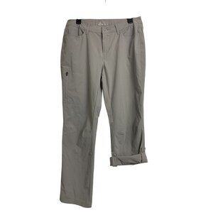 Designed for outdoor enthusiasts, these gray pants feature a minimalist design with functional details such as adjustable button-tab legs and multiple pockets for convenience.