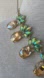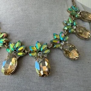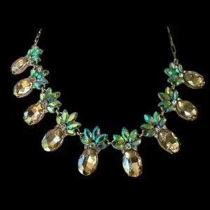 Adorned with beautiful hues of taupe and iridescent green and clear colored Austrian crystal pineapples. Gold tone chain.