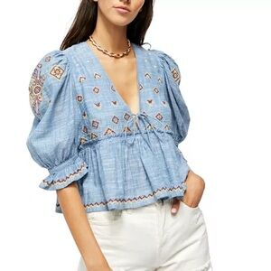 Free People Tallulah Embroidered Blue Babydoll Top Size XS