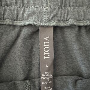 Vuori Performance Joggers Womens Large DreamKnit Green High Rise Yoga Athleisure. See pics for measurements. In good condition. Logo on front thigh. Has pockets. Full length-28 inseam. Elastic waist with drawstring. Its a greenish/gray color. Super soft and stretchy. From a smoke free/pet free home
