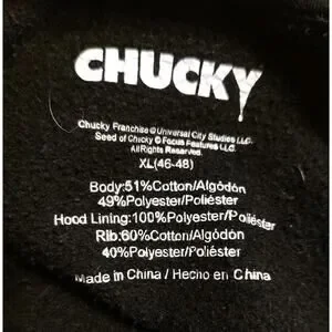 The Men's Chucky Child's Play Hoodie Pullover is a stylish and creepy addition to any horror fan's wardrobe. This XL hoodie features graphic print of the iconic Chucky character, complete with a drawstring closure, round neckline, and long sleeves. The multicolor design, along with the horror theme and Halloween features, make it perfect for casual wear or Halloween activities. Made from a comfortable cotton blend fabric, this pullover hoodie is a must-have for fans of the horror genre.