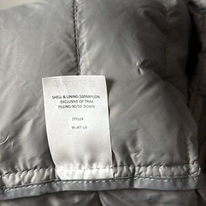 Small area on front left side (shown in pic) where it has a slight mark but not very noticeable at all- price reflects this small flaw! + this jacket is PACKABLE!!!!!!!!!! Really pretty grey color