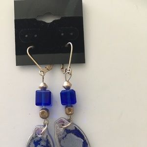 One of a kind blue and silver pierced earrings. 2 3/4” long. Hand crafted.