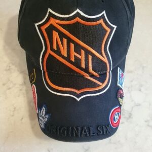 You've been looking for a truly unique way to express your love for the NHL. Well search no more, because this Original 6 adjustable black hat is perfect for you! The embroidered graphics on this cap refer to the six original franchises in the league. Very little fading, no rips or stains, great condition for being over 20 years old!
