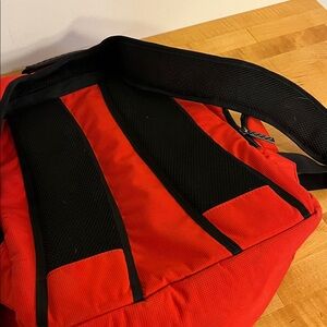 Bold red Ferrari Puma backpack with black accents. Features iconic logo design. Ideal for daily use.