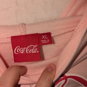 Soft pink hoodie with Coca Cola logo. Comfortable and stylish for casual wear.