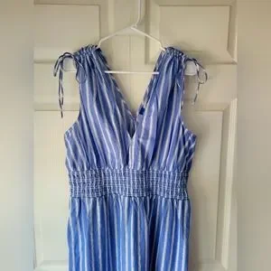 Chic and comfortable, this blue and white striped sleeveless dress is perfect for any occasion. The lightweight fabric and stylish design make it a must-have for your wardrobe.