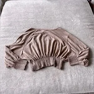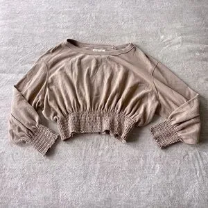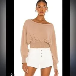 The Free People "Run To You Tee" in Wheat Combo embodies a bohemian and relaxed aesthetic, characteristic of the brand's signature style. This long-sleeve top features a soft knit fabric with smocking details and a bell sleeve design, contributing to its free-spirited and casual appeal.
