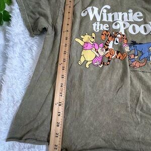 Disney t-shirt in olive green. Soft and comfortable fabric. This is the perfect addition to your wardrobe! Featuring a classic graphic of Winnie the Pooh and his friends (Tigger, Piglet, Eeyore, and Rabbit), this tee has a faded olive green color that gives it a cool vintage look.