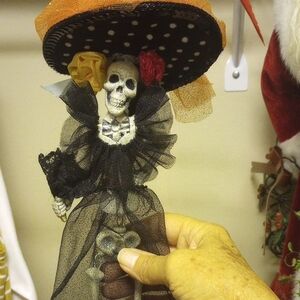Add a touch of gothic elegance to your home with this black skeleton figurine. Featuring vibrant orange and yellow accents, this piece is perfect for those who appreciate unique home decor.