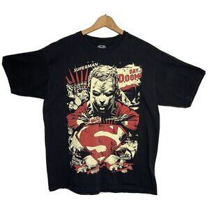 Show off your love for Superman with this XL black "Day of Doom" T-shirt. Featuring TM & DC Comics artwork, it's perfect for fans. Comfortable and stylish, it's a must-have for any comic book enthusiast.