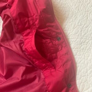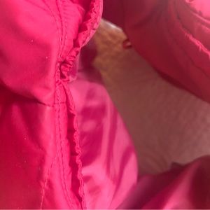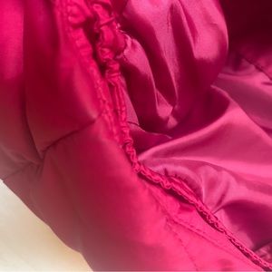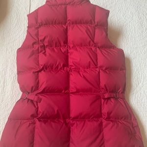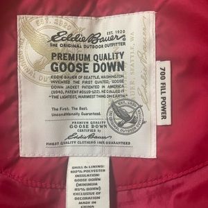 Eddie Bauer Goose Down vest in a TALL large size! Very pretty magenta color (or dark hot pink). Color of the up close label shows the color the best. Cinches in at the waist with adjustable straps. Zips and snaps closed to keep out the elements. Zippered exterior pockets and Velcro interior pocket. Freshly washed but a few light stains remain on the interior and under arms (see last few photos.)Smoke and pet free. Measures about 21 inches across the bust, 26 inches from shoulder to hem.
