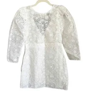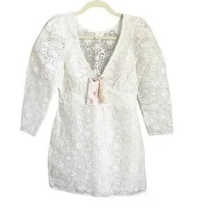 White lace mini dress, puff sleeve dress, deep V-neck dress, floral eyelet dress, romantic feminine style, vintage inspired dress, bridal shower outfit, boho chic dress, fitted waist dress, elegant cocktail dress, delicate embroidered dress.