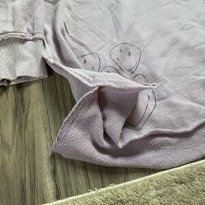 Fun and comfy weathered oversized light purple sweatshirt with smiley face accents. Perfect for a cheerful look and relaxing moment.