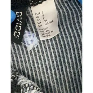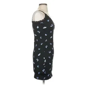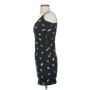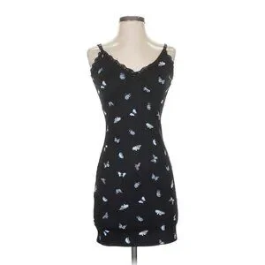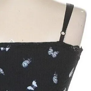 This black ribbed mini dress by Divided x H&M features a charming butterfly print & delicate lace trim. Its fitted style & sleeveless design offer a flattering silhouette, suitable for various casual settings.