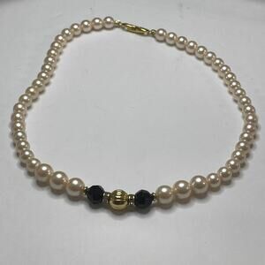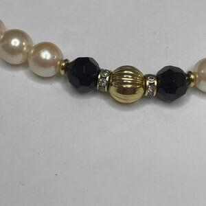 Picturing the fashion costume jewelry faux pearls with black beads and gold tone setting ** Length: 17" ** Condition: Pre-owned condition, gently worn, May Need a light cleaning before wear. * I ship quickly from a clean smoke-free home *** Inventory: bag 59 10806 Don't miss this necklace beads versatile faux pearls in gold tone perfect for contemporary career or casual wear