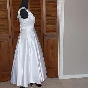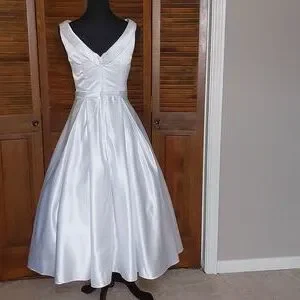 White 1950s Style Satin A-Line Tea Length Wedding Dress and Bow Veil Sz 6