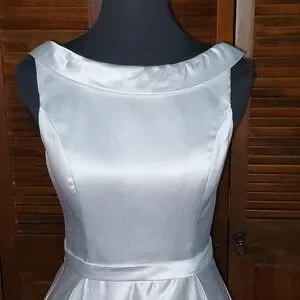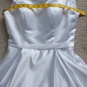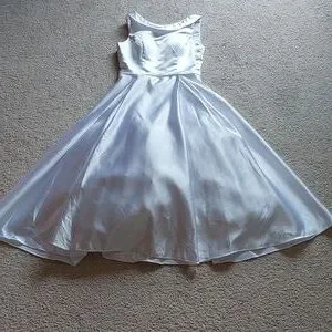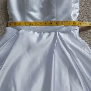 Bring back the classic timeless glamor of the 1950s on your wedding day, with this white retro satin a-line tea length wedding dress with back zip, structured bust, attached waist belt, and built in crinoline. There are small pinholes on collar (pictured). Pair with a pair of cute white flats, or colorful kitten heels, or your highest stilettos.