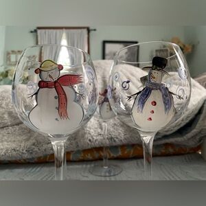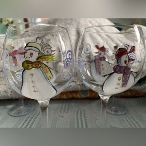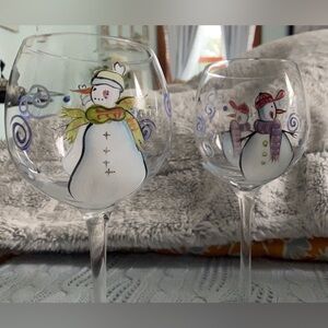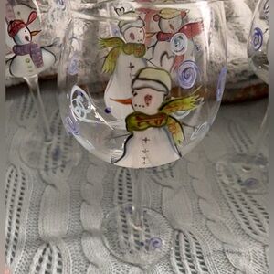 Set of four wine glasses with hand painted snowman design. Features colorful scarves and hats.
