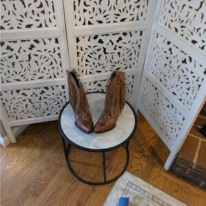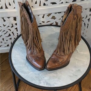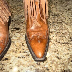 Stylish brown heeled boots with fringe detail. Intricate stitching on the toe. Perfect for a bold look. Very minimal use.