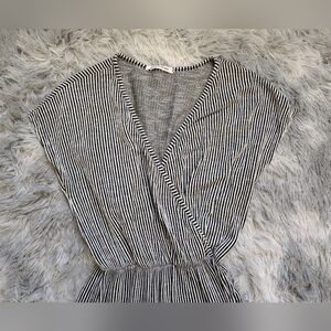 Caution to the Wind women's medium black and white ribbed faux wrap maxi dress. Pre-owned but in great condition. Faux wrap style with tie in the back. Cinched waist for a more flattering fit. No size or care tag, but was told it was a medium when purchased, and it does fit like one.