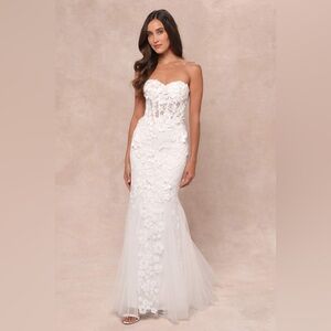 LULU’S Adoring Bliss White Tulle Strapless Lace Up Mermaid Maxi Dress
