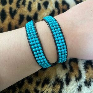 Brown cord and colorful faux turquoise beads. About twelve inches long (not counting the adjustable button closure). Signed Lulu Dharma.