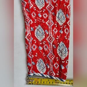 Stylish red quilted jacket with white patterns. Open front design side pockets. Perfect for layering.